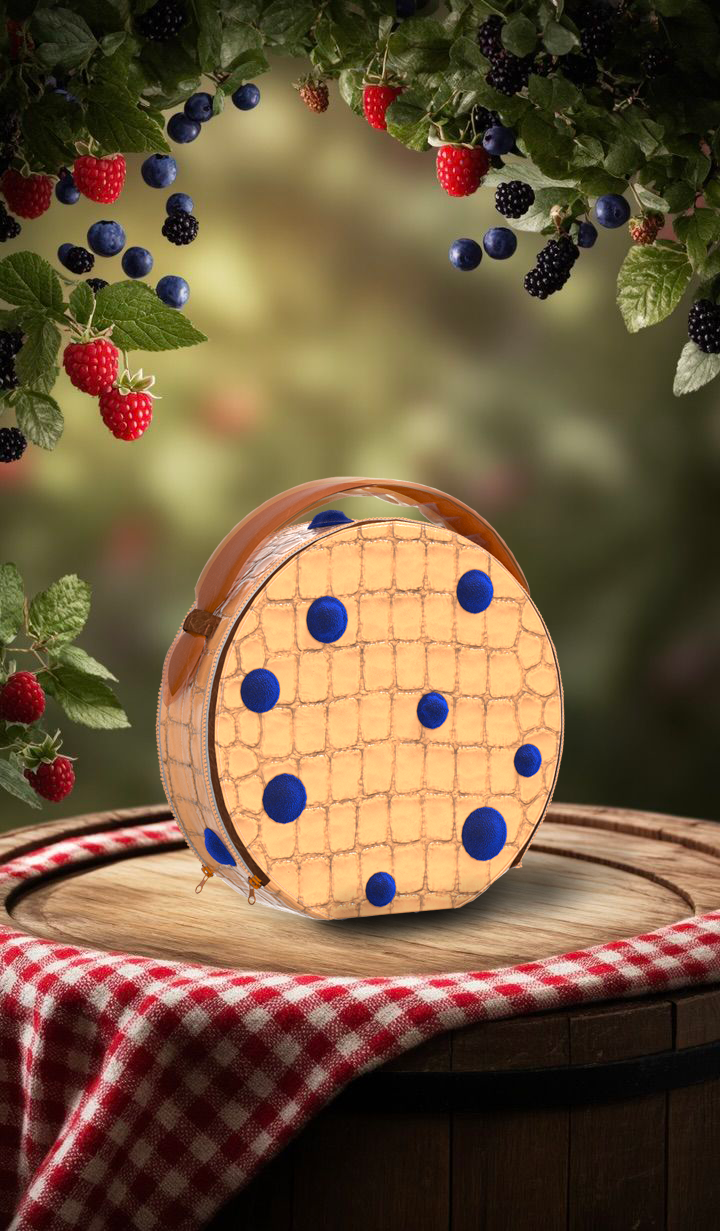 A circle bag inspired by blueberry pancakes (part of my Brunch collection). The bag is made of faux croc leather, and the blueberry feature is made of velvet with stuffing. The handle is made of leather with a PVC casing.